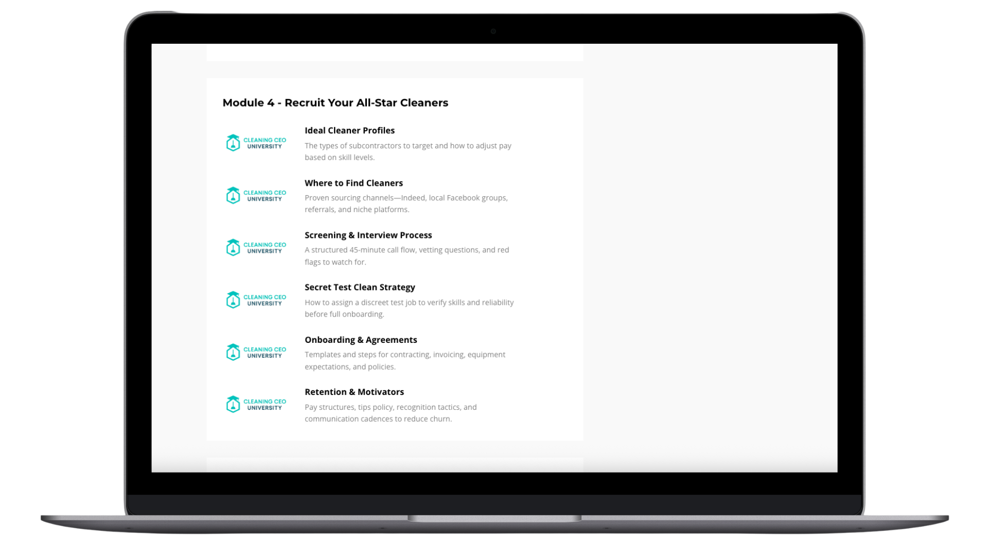 Use the proven system 100+ entrepreneurs used to replace their 9-to-5 and buy back their freedom. Get your first client within 14 days. Hit $10K months within 90 days. 100% of the cleaning subcontracted to vetted cleaners.
